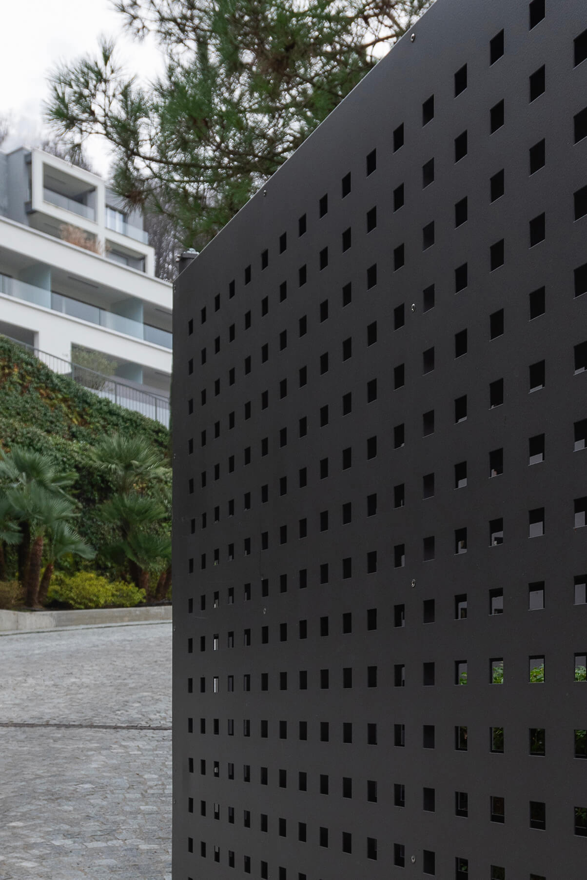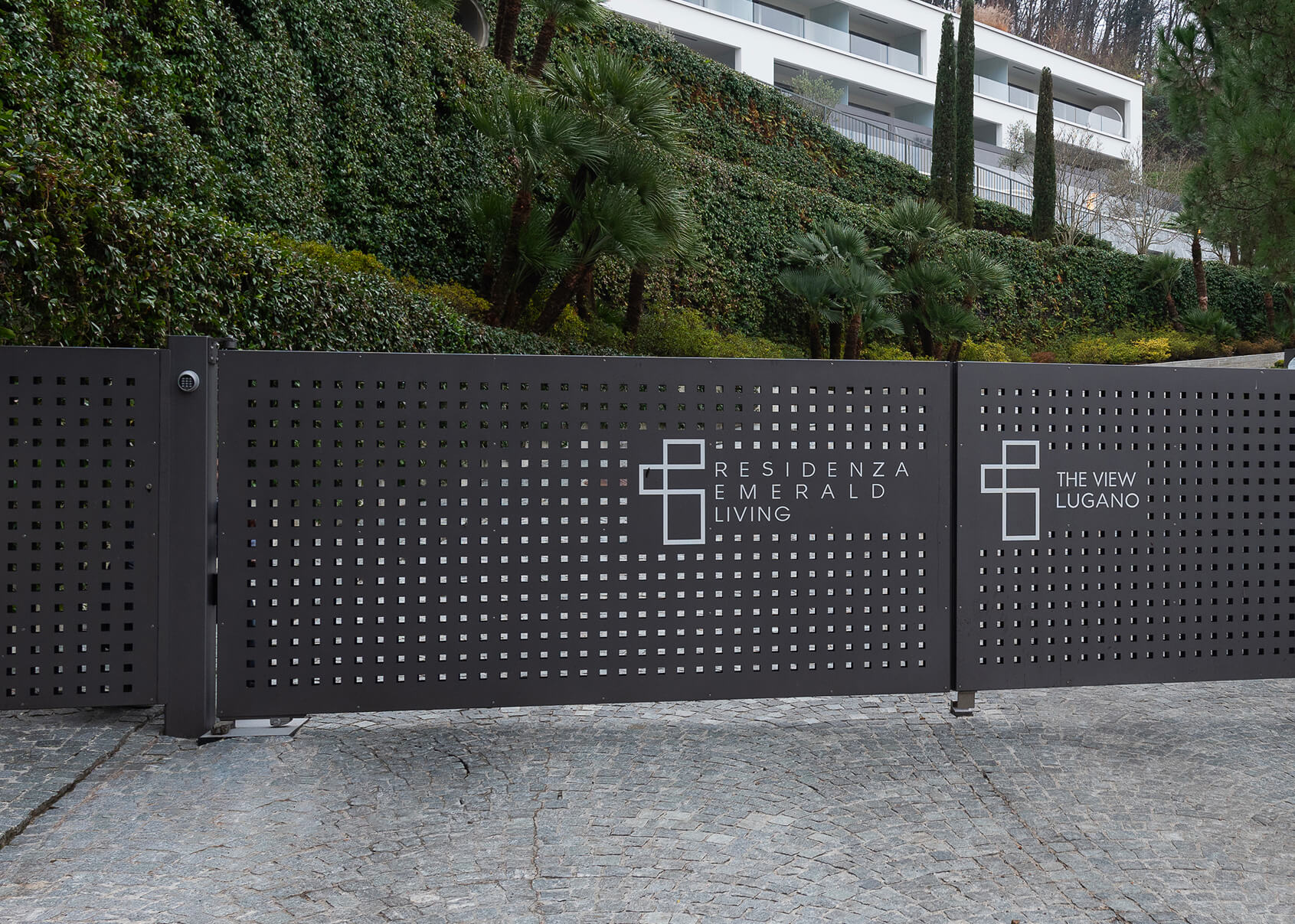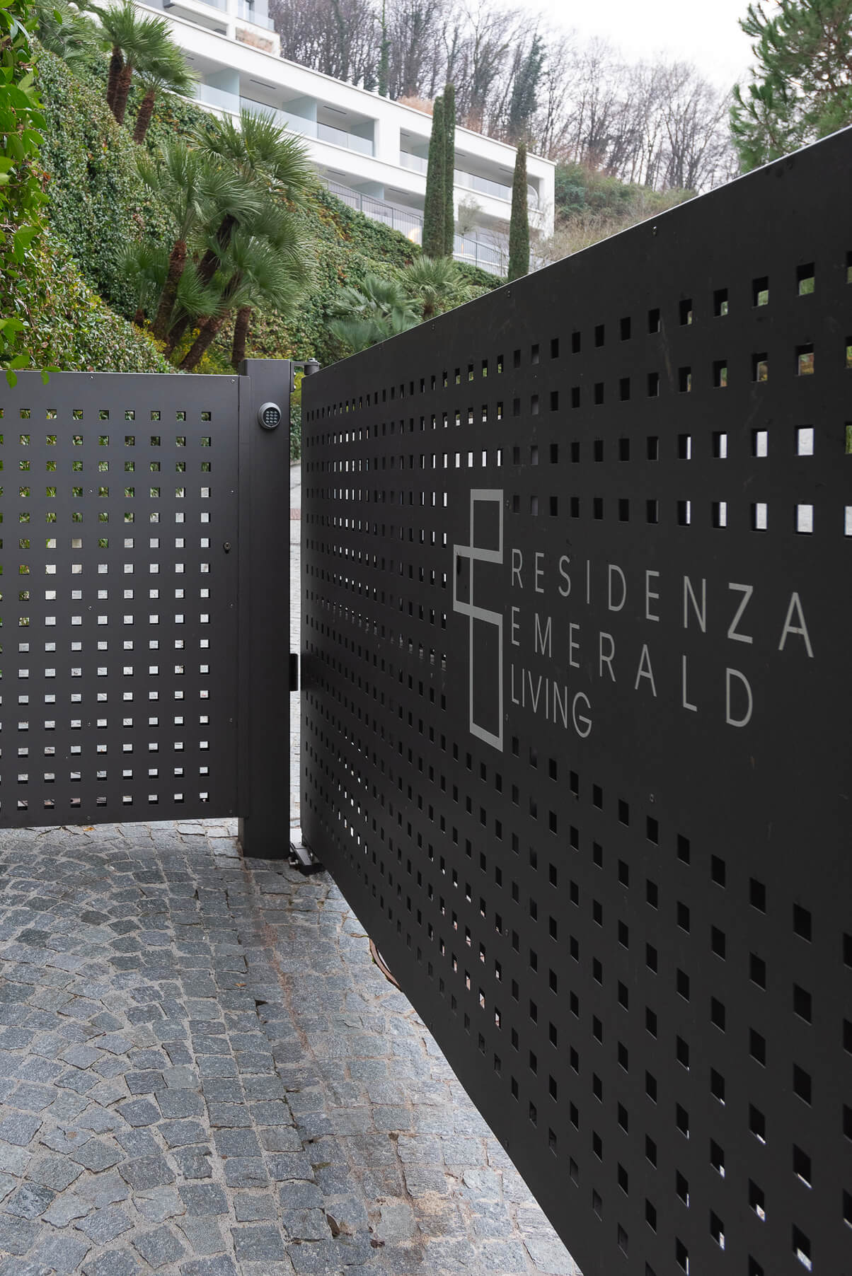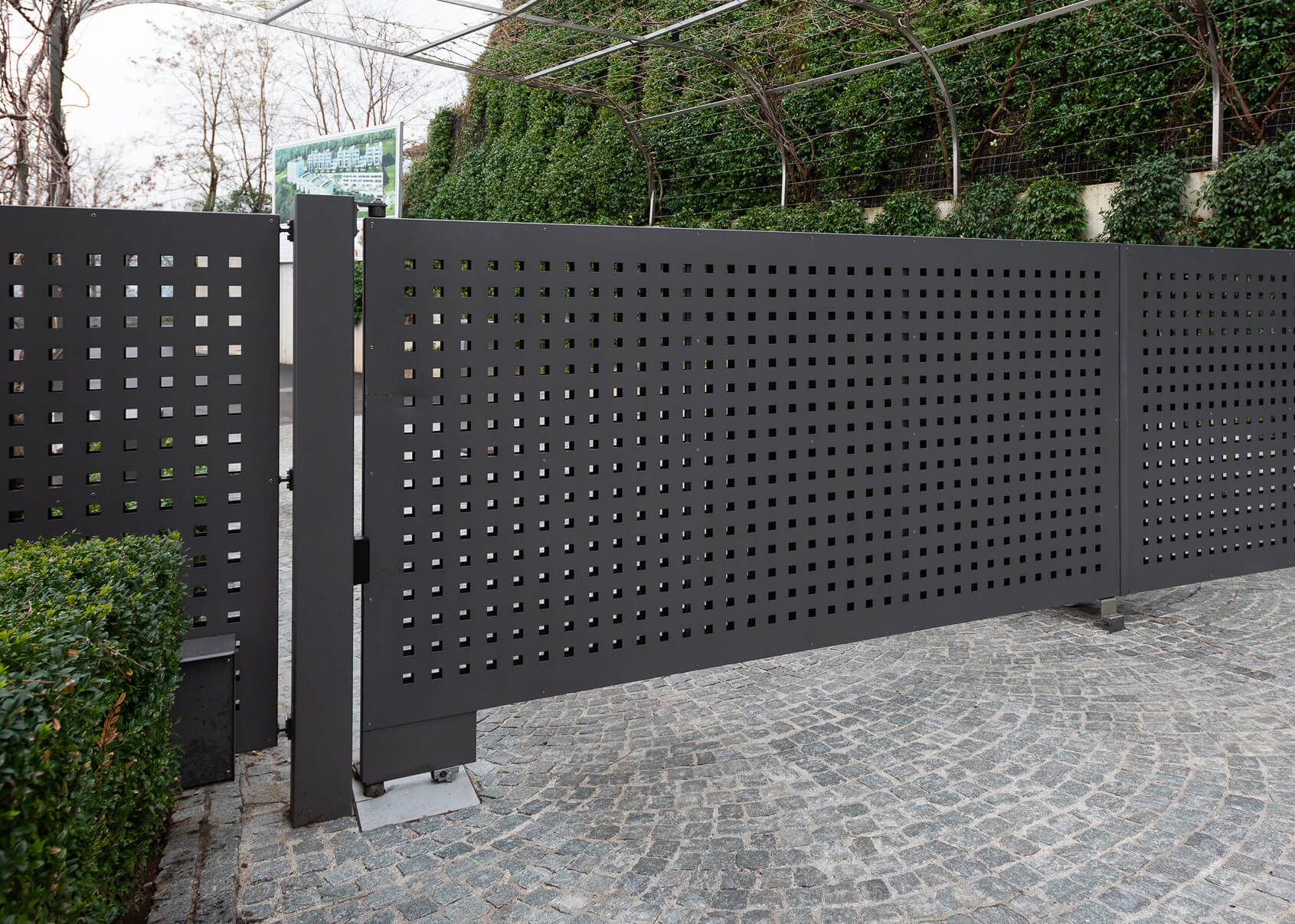 Cancello a due ante battenti di grandi dimensioni con automazione interrata, cancello pedonale integrato e tamponamento in lamiera forata.