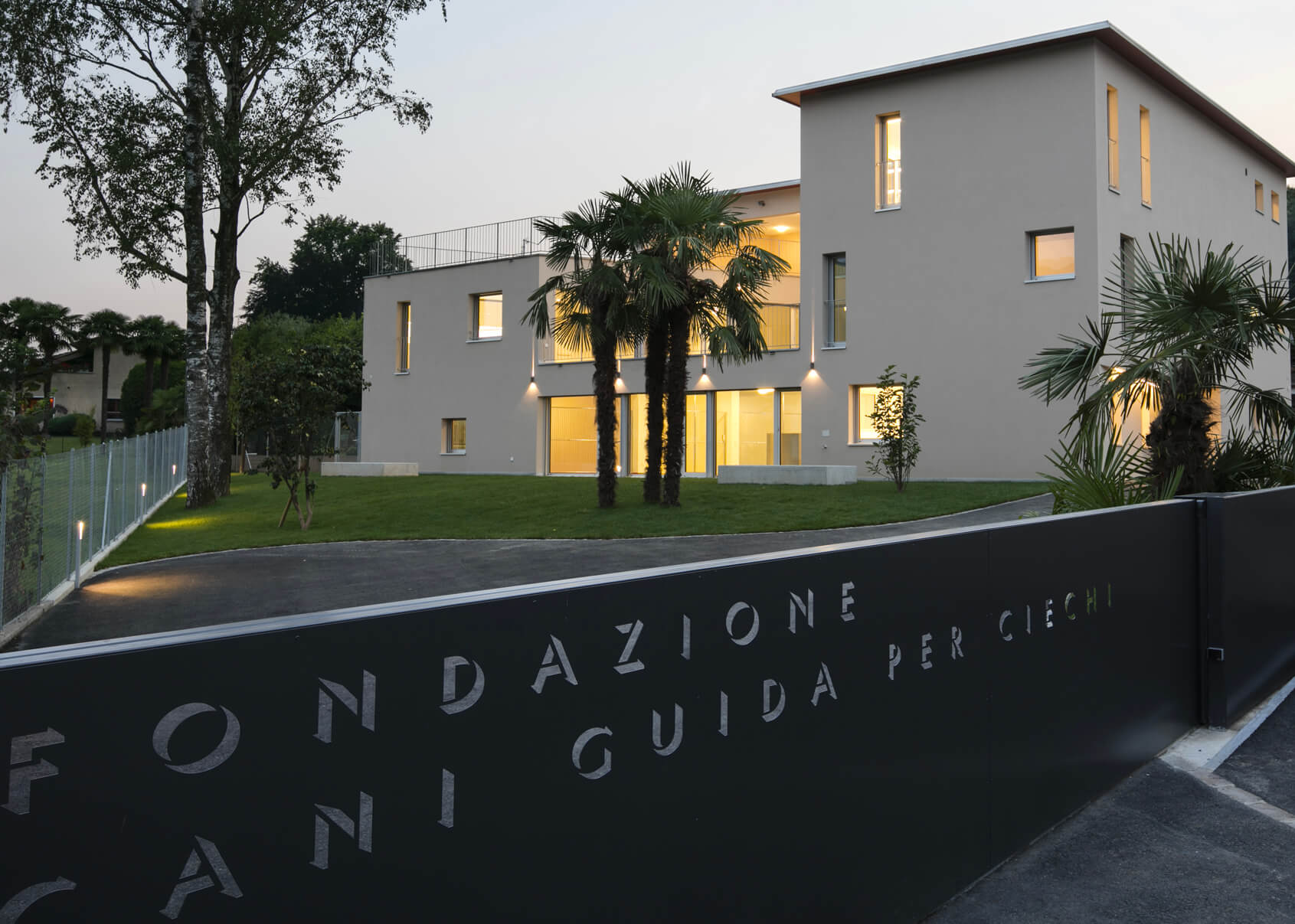 Cancello scorrevole su guida inferiore, con totem integrato, cassetta postale, illuminazione LED e delimitazione perimetrale armonizzata nel design.