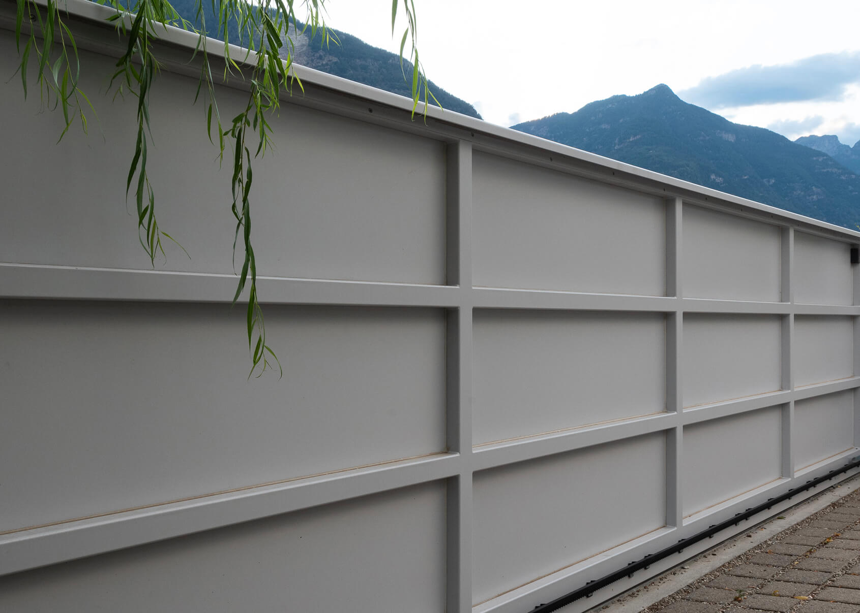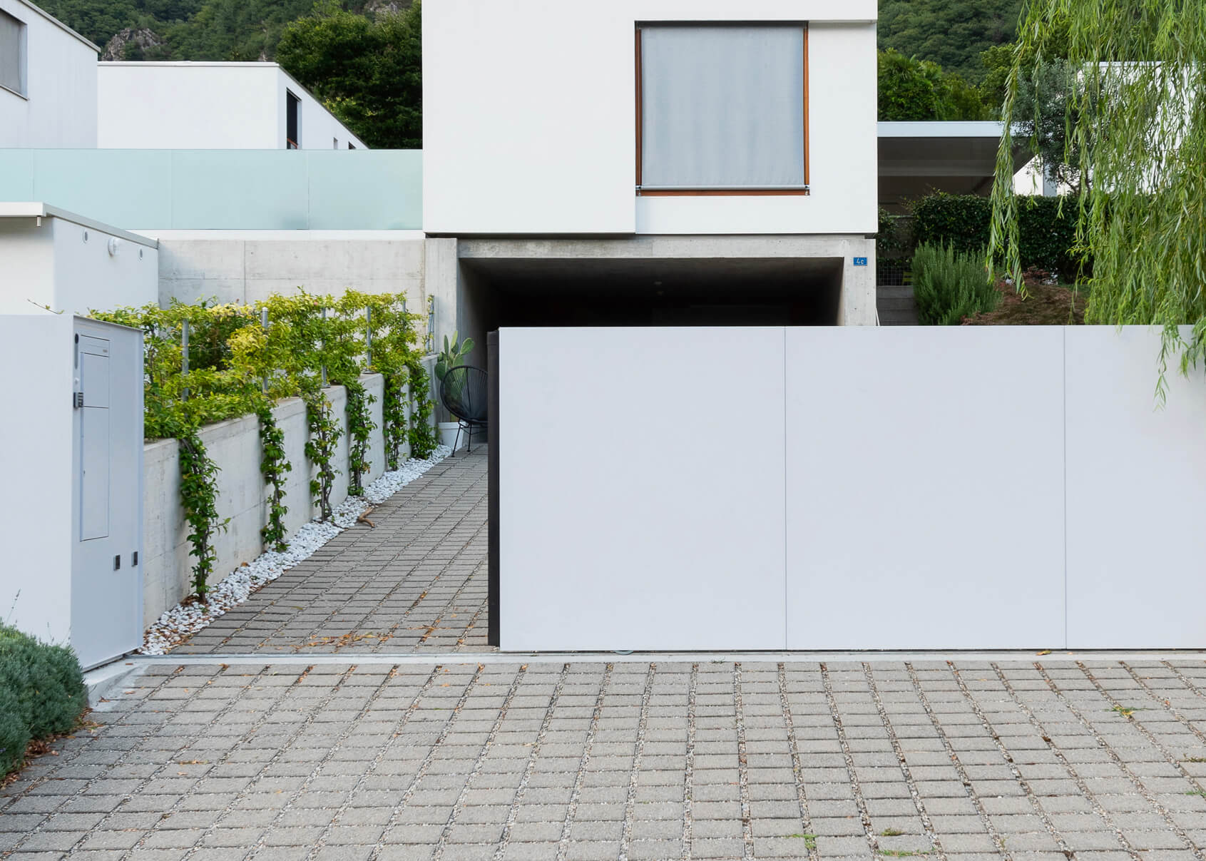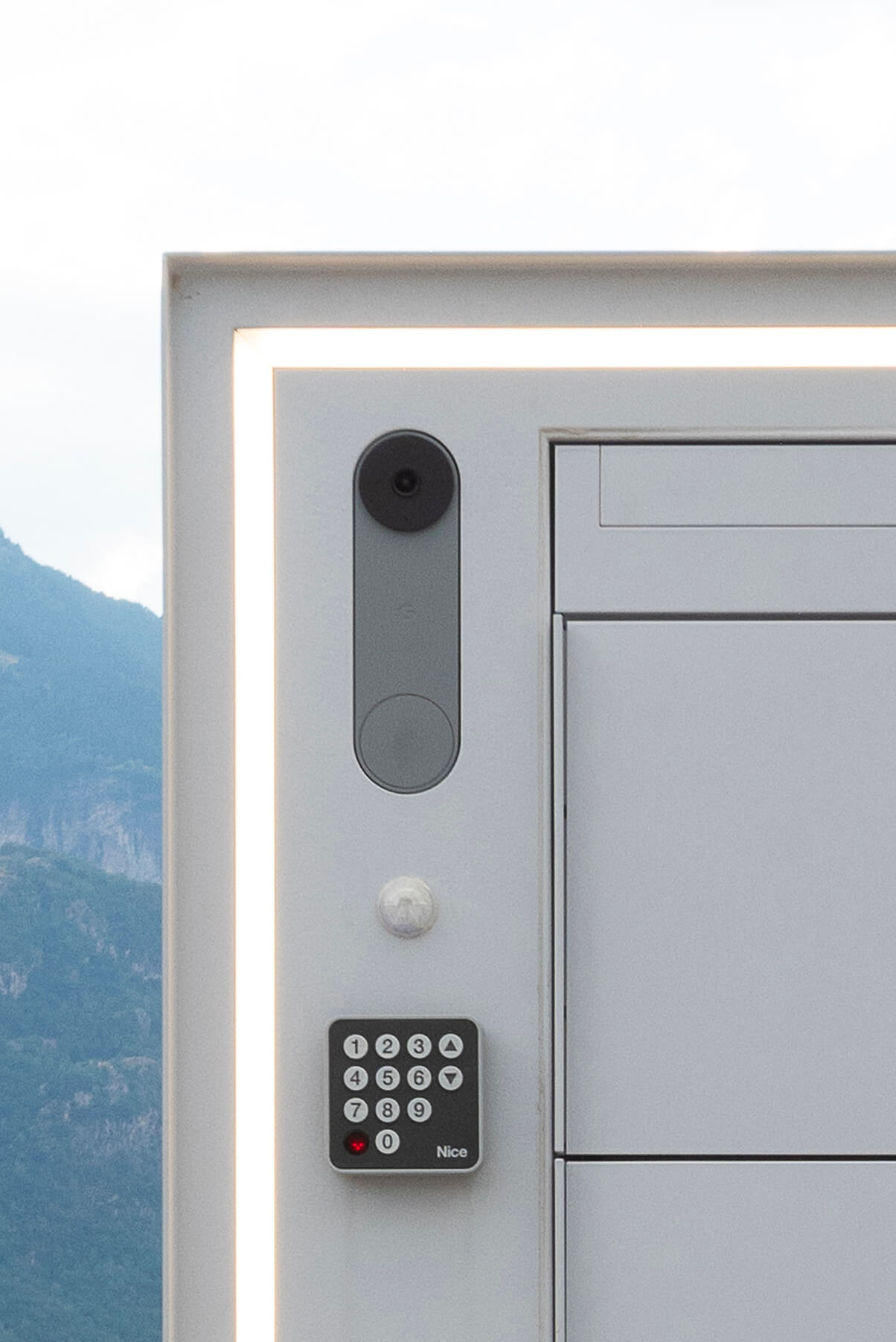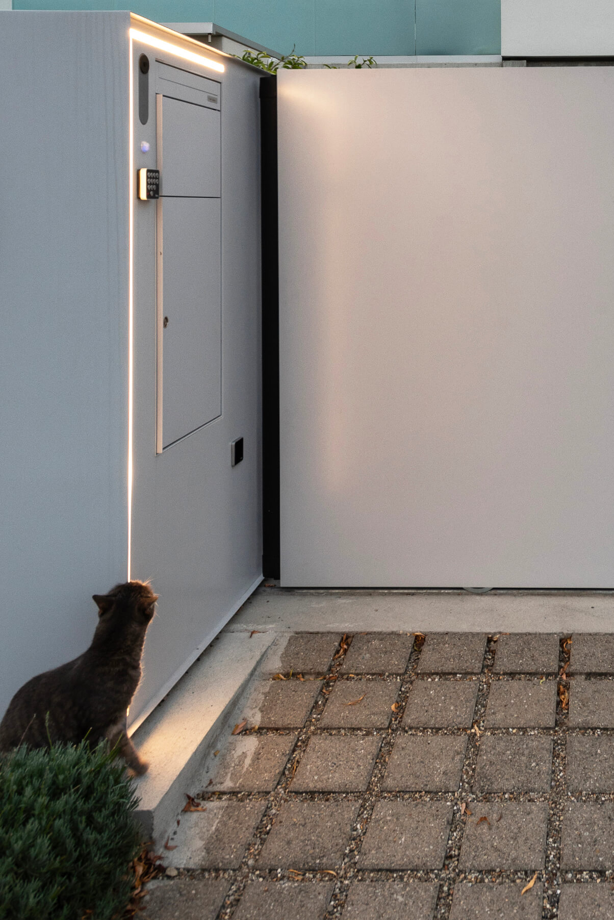 Cancello scorrevole su guida inferiore con totem integrato, cassetta postale, modulo per pacchi e illuminazione LED.