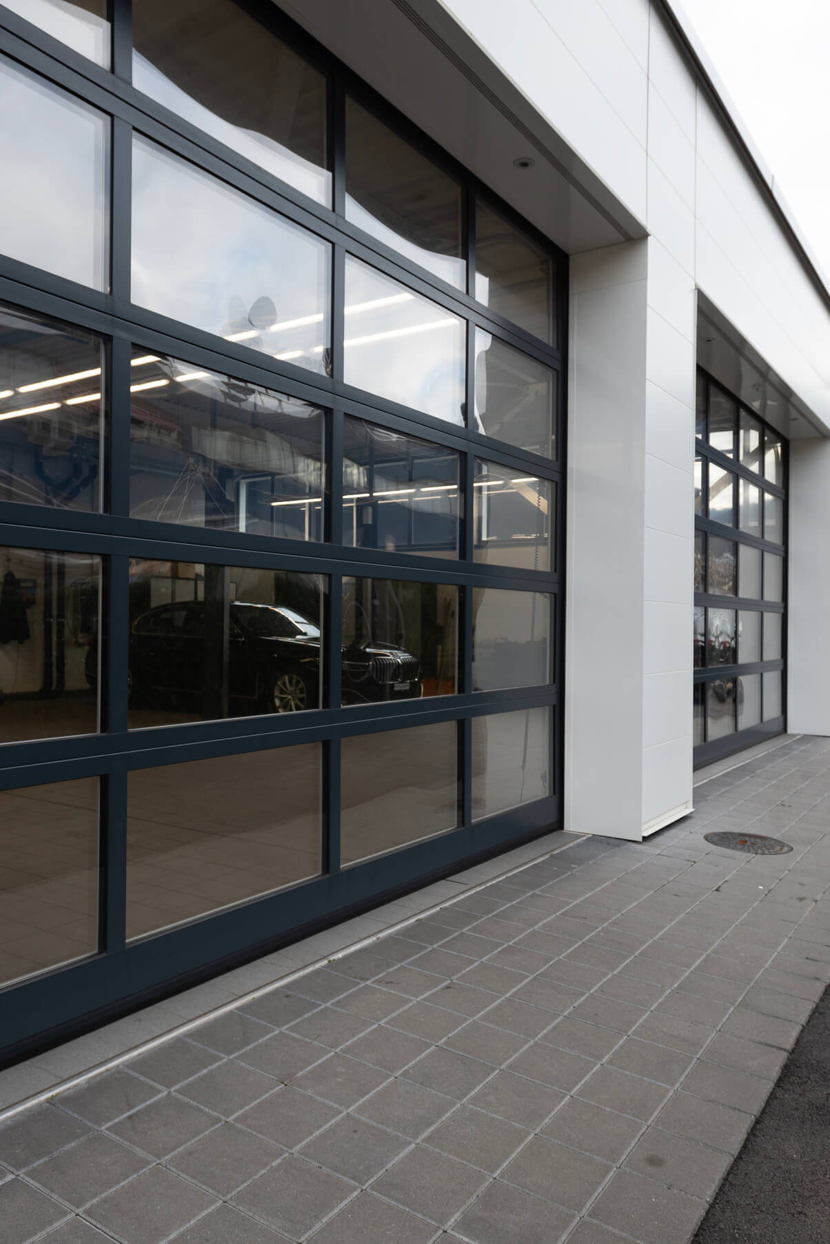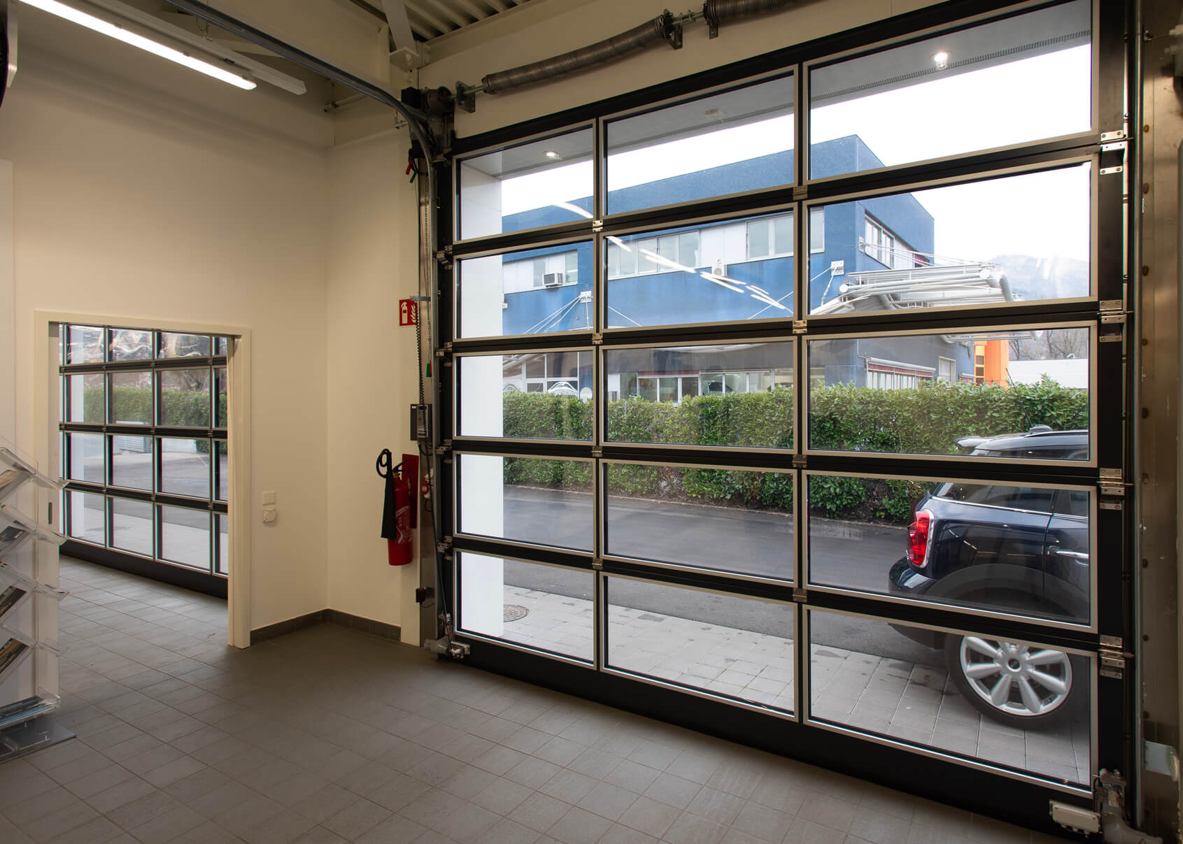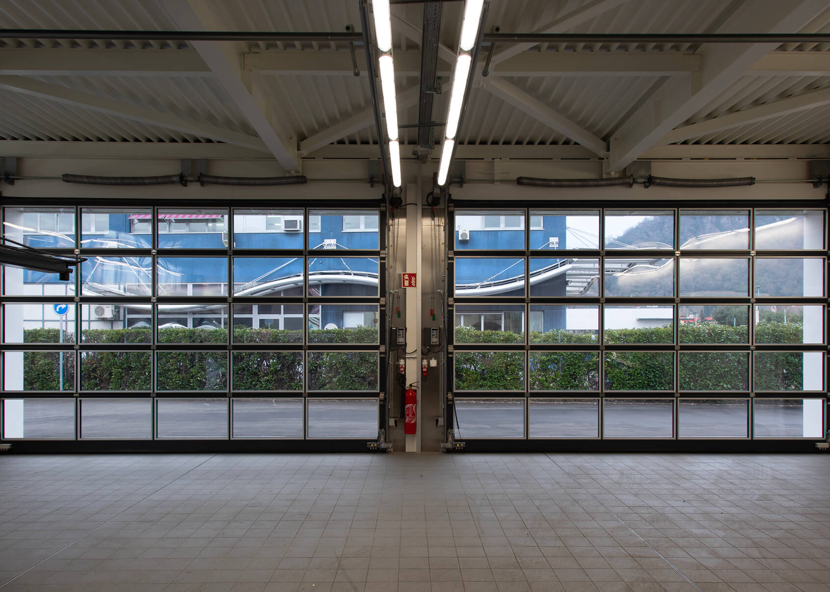 Porte garage sezionali industriali full vision, dotate di molle di bilanciamento e paracaduti di sicurezza.