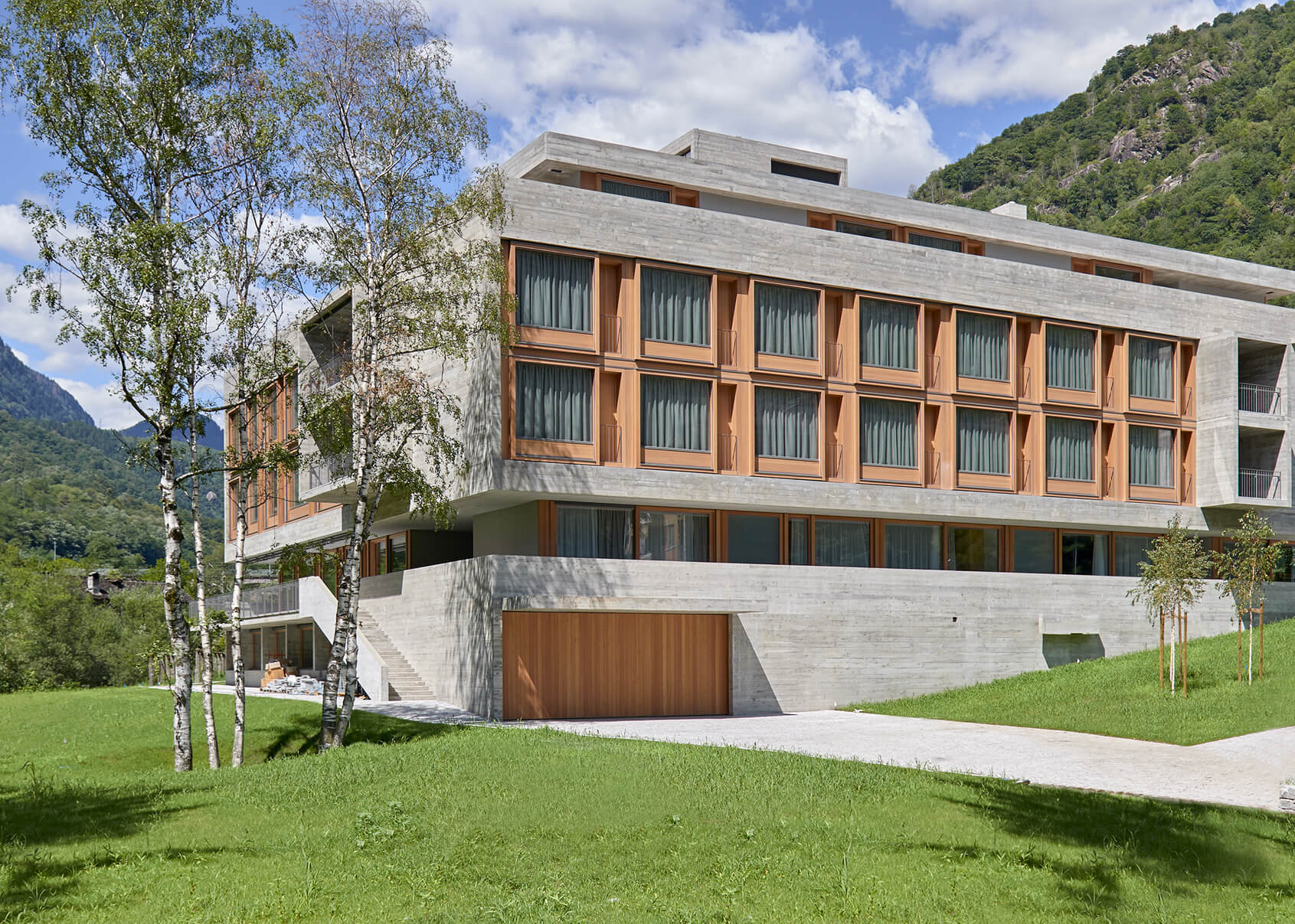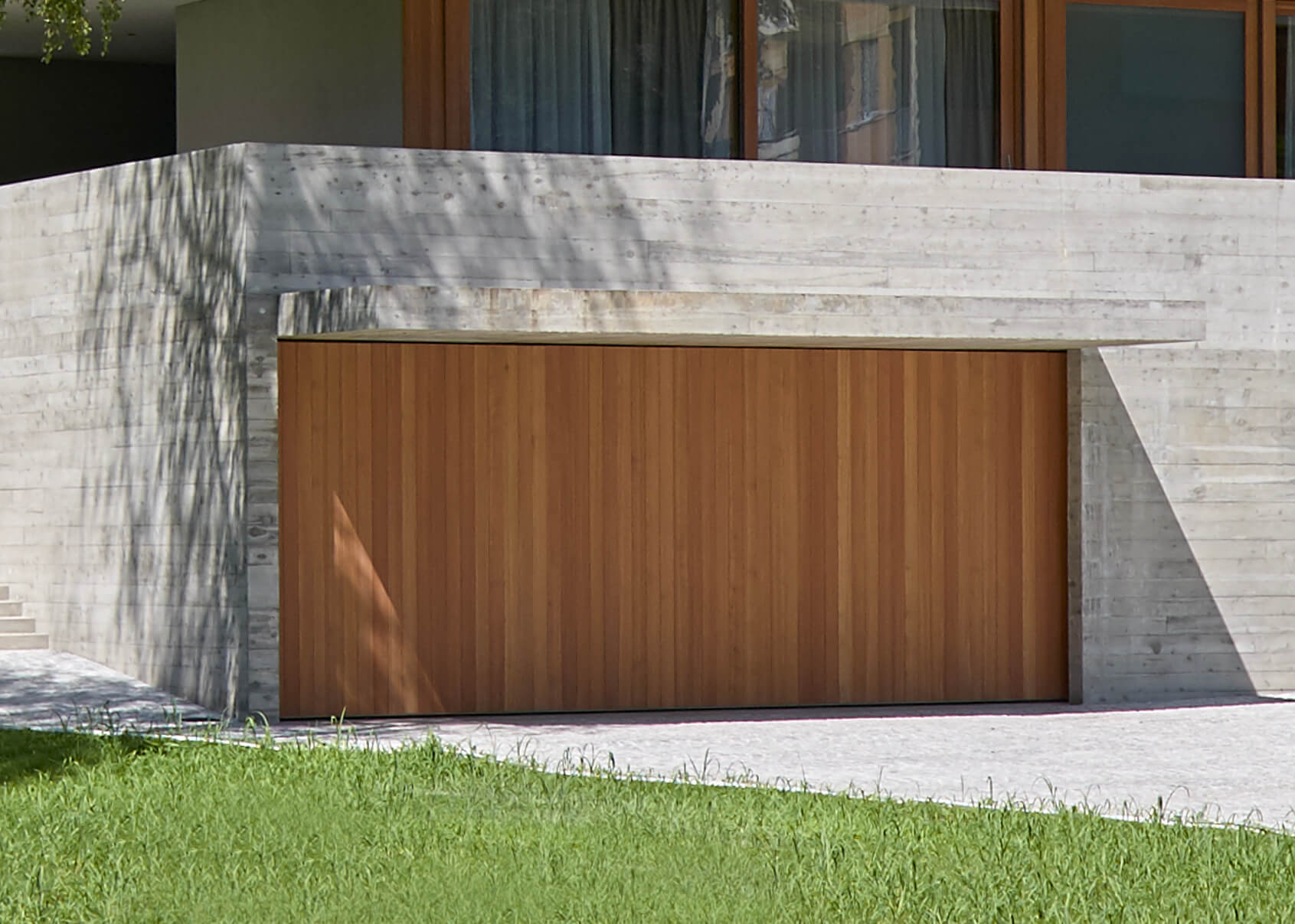 Porta garage scorrevole isolata di grandi dimensioni, con binario inferiore e manto in doghe di legno verticali.