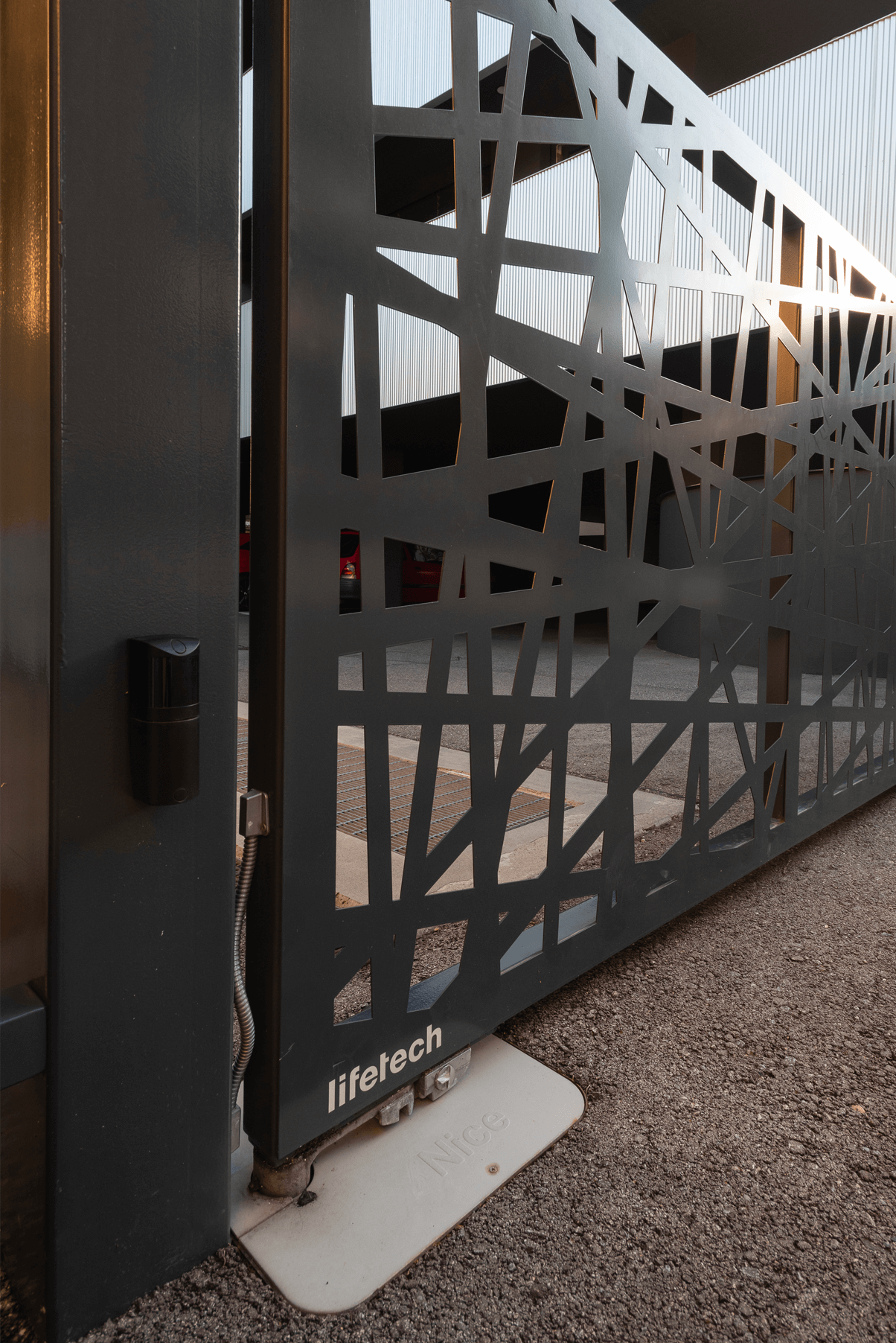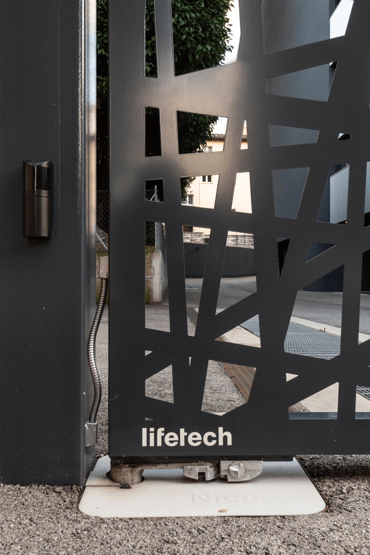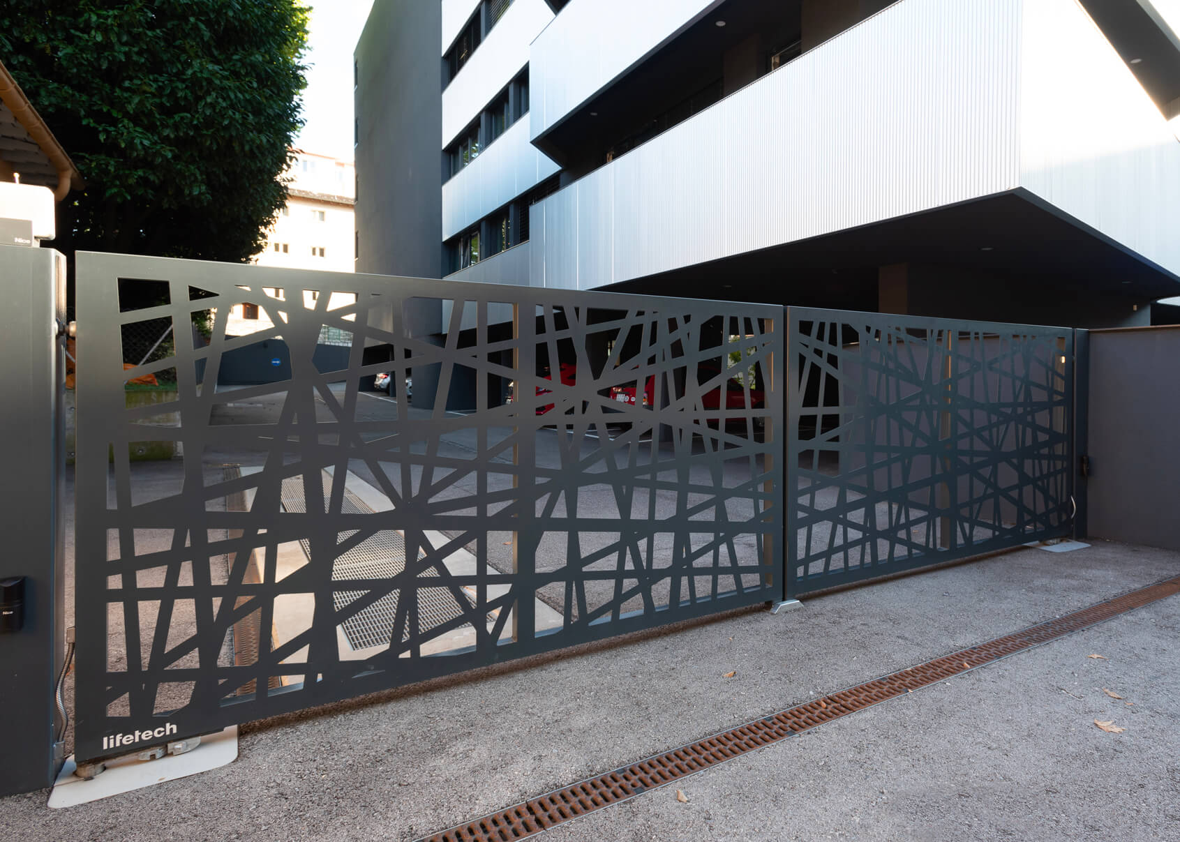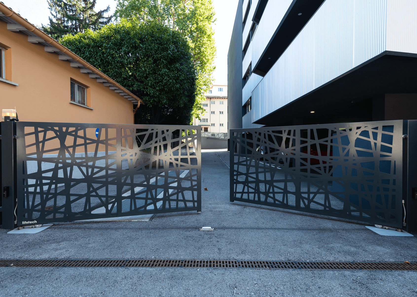 Cancello a due ante battenti con automazione interrata e tamponamento in lamiera di alluminio tagliata al laser.