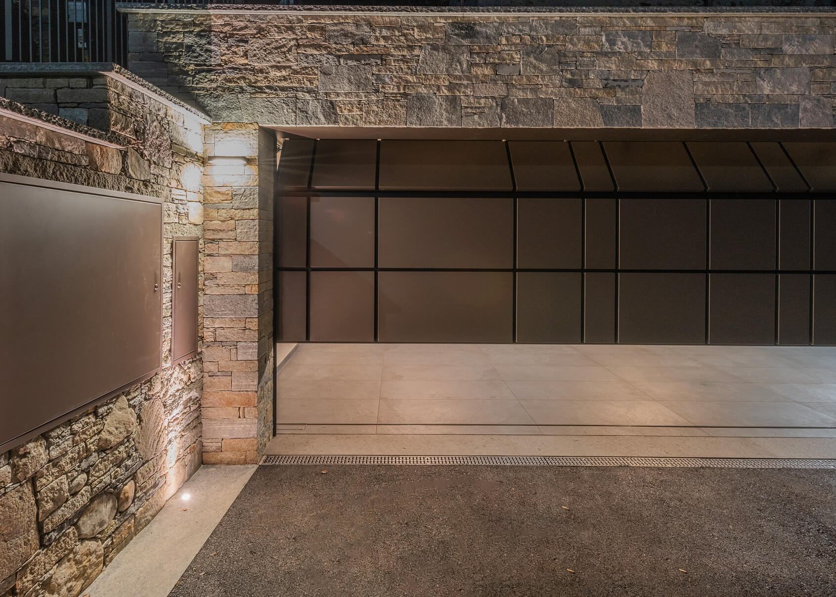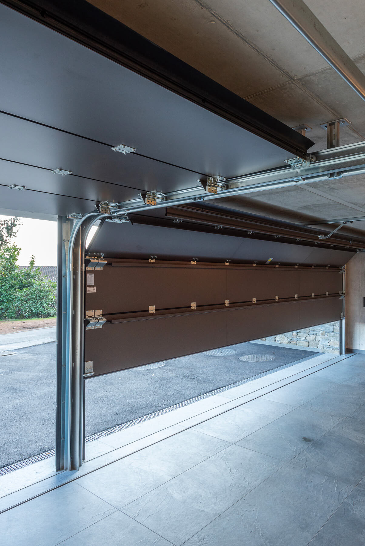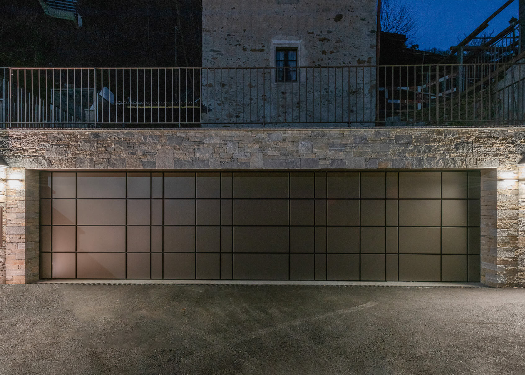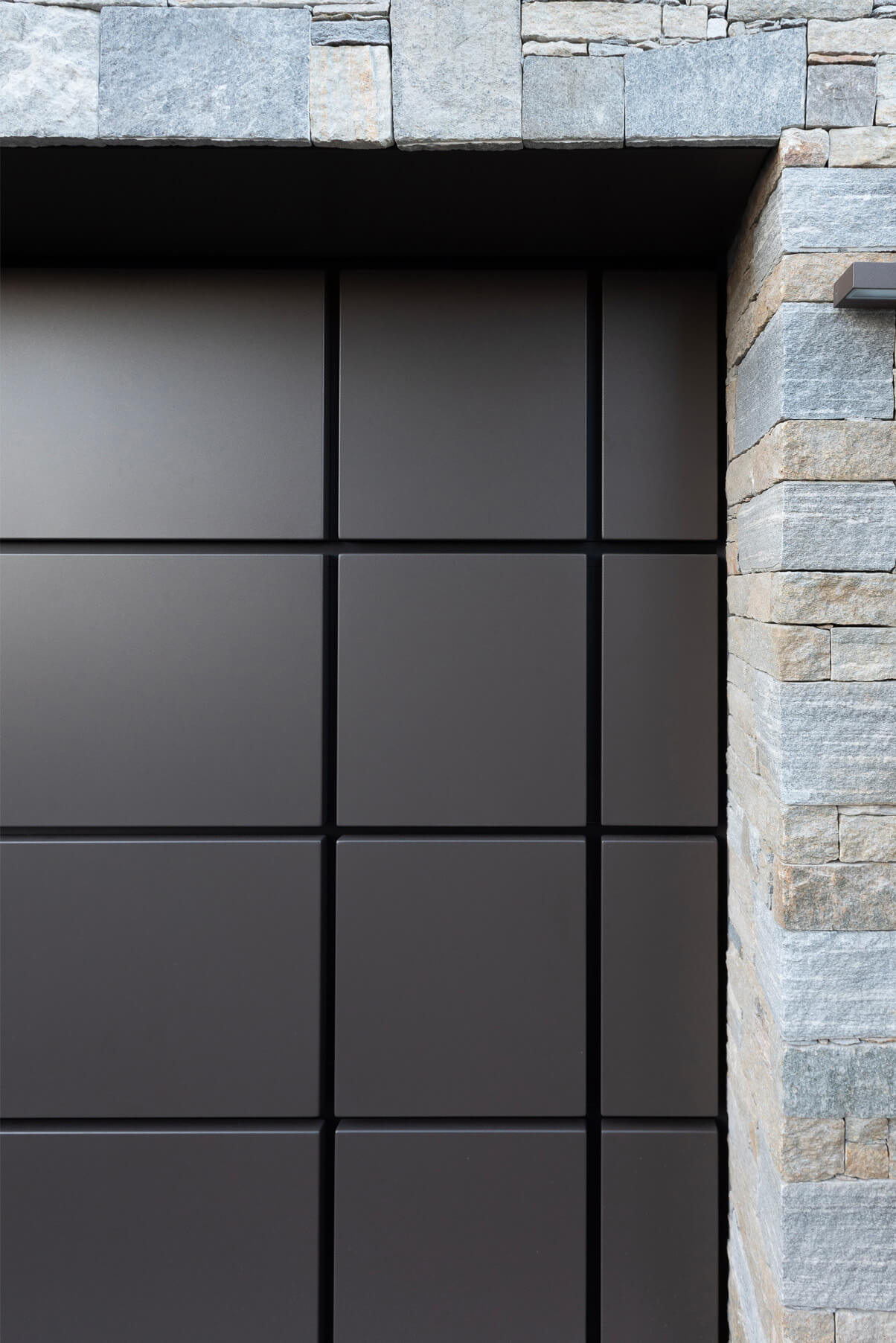Porta garage sezionale con manto esterno in moduli a scacchiera e rivestimento interno mediante isolazione e lamiera piana
