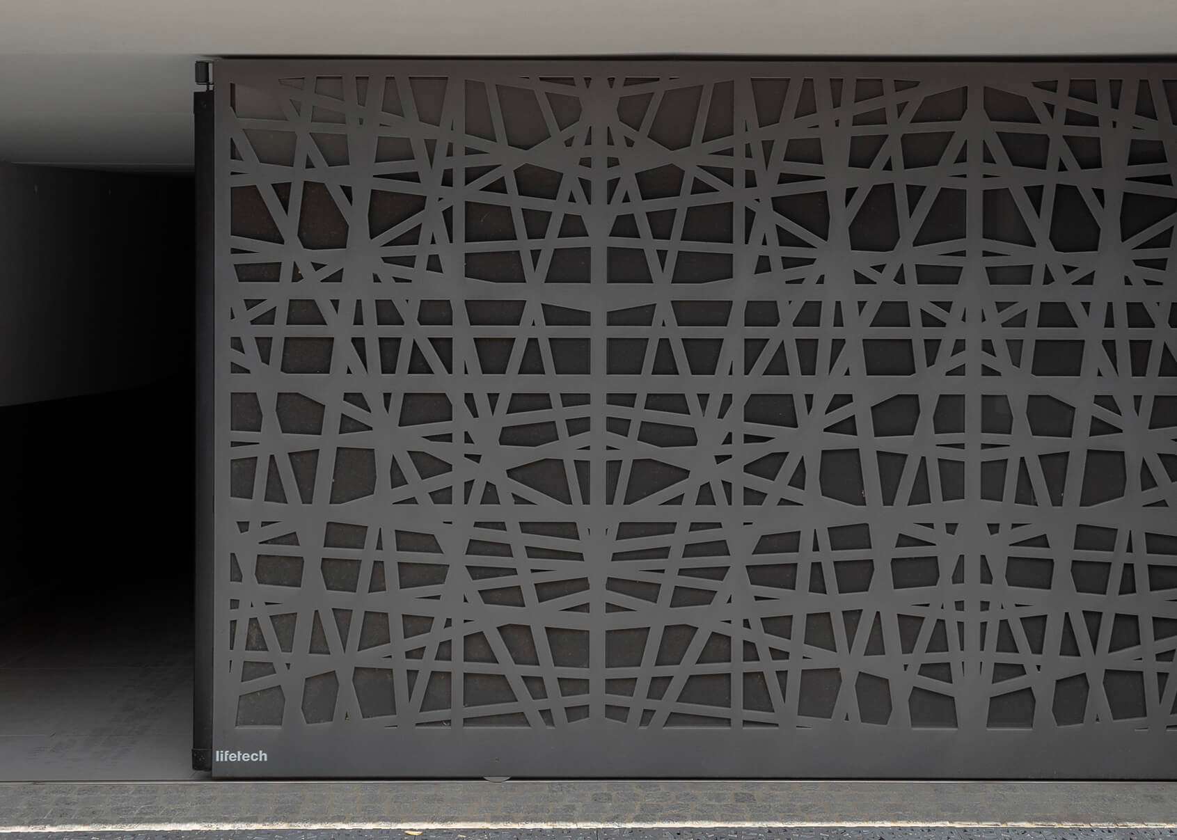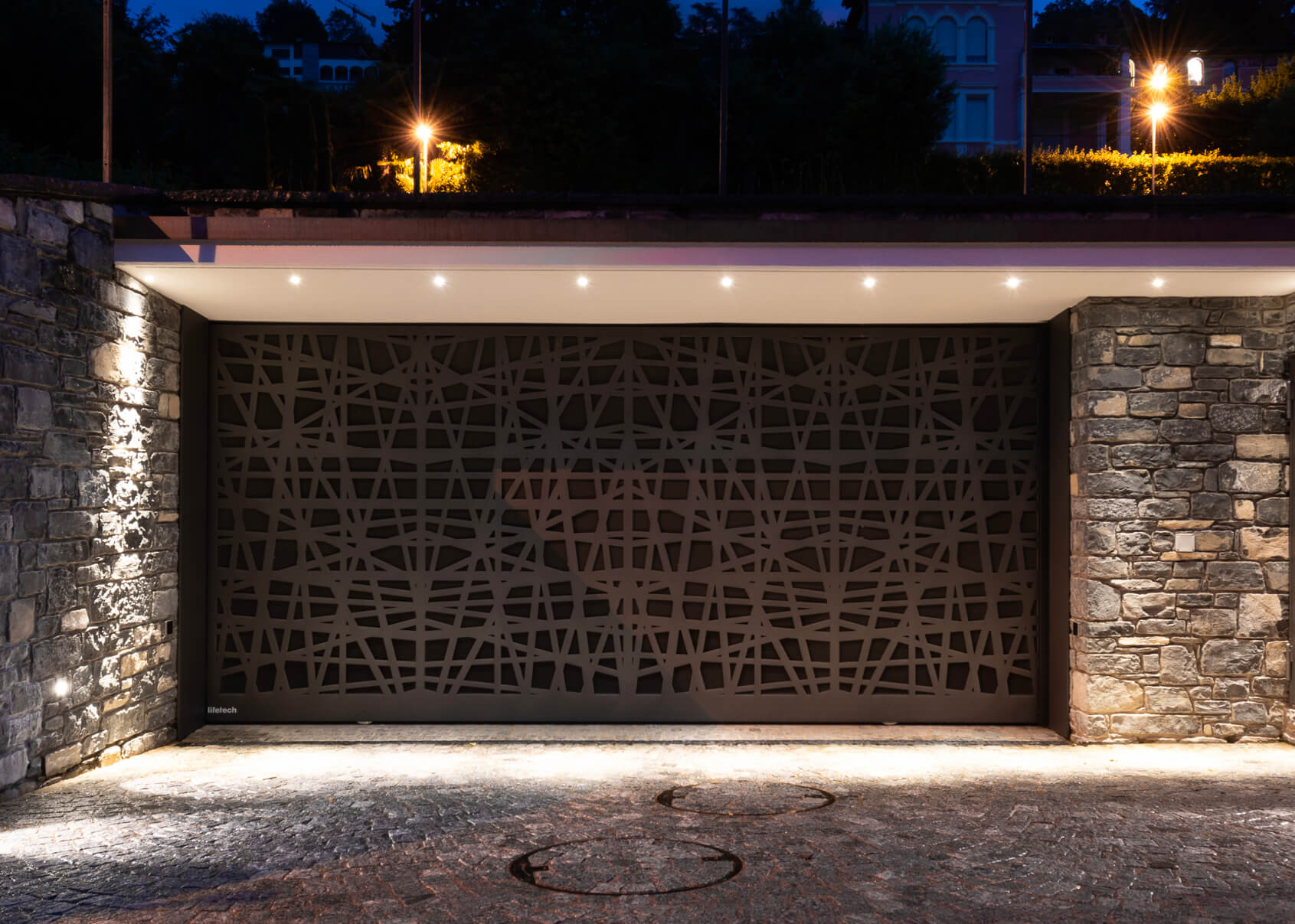 Porta garage scorrevole su binario inferiore, con rivestimento in lamiera d’acciaio tagliata al laser.